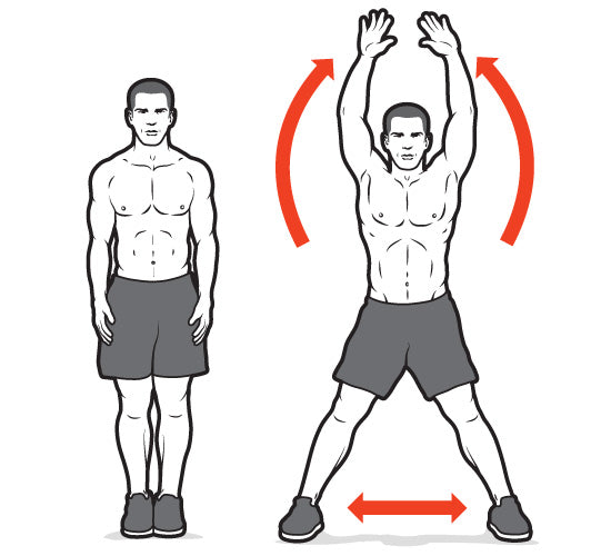 Jumping jacks are a very common fat-burning and classic aerobic warm-up in cardio. There are multiple benefits to incorporating it into your daily exercise program. It increases your heart rate, makes your muscles stronger, helps with weight loss, strengthens your bones and immediately lifts your mood, and helps relieve stress.